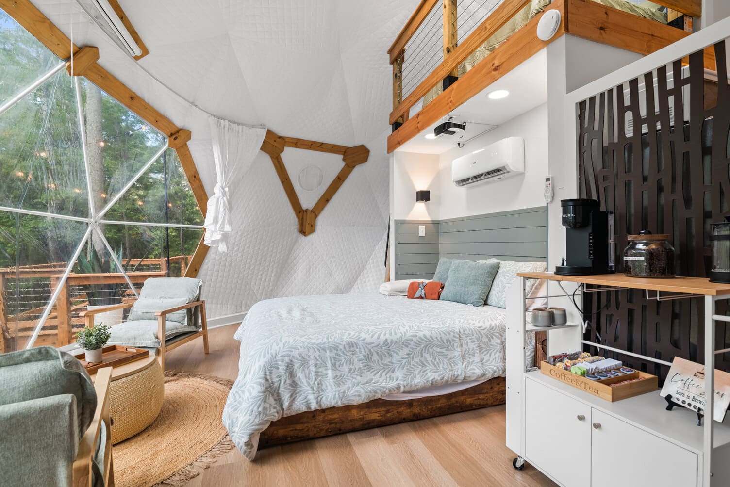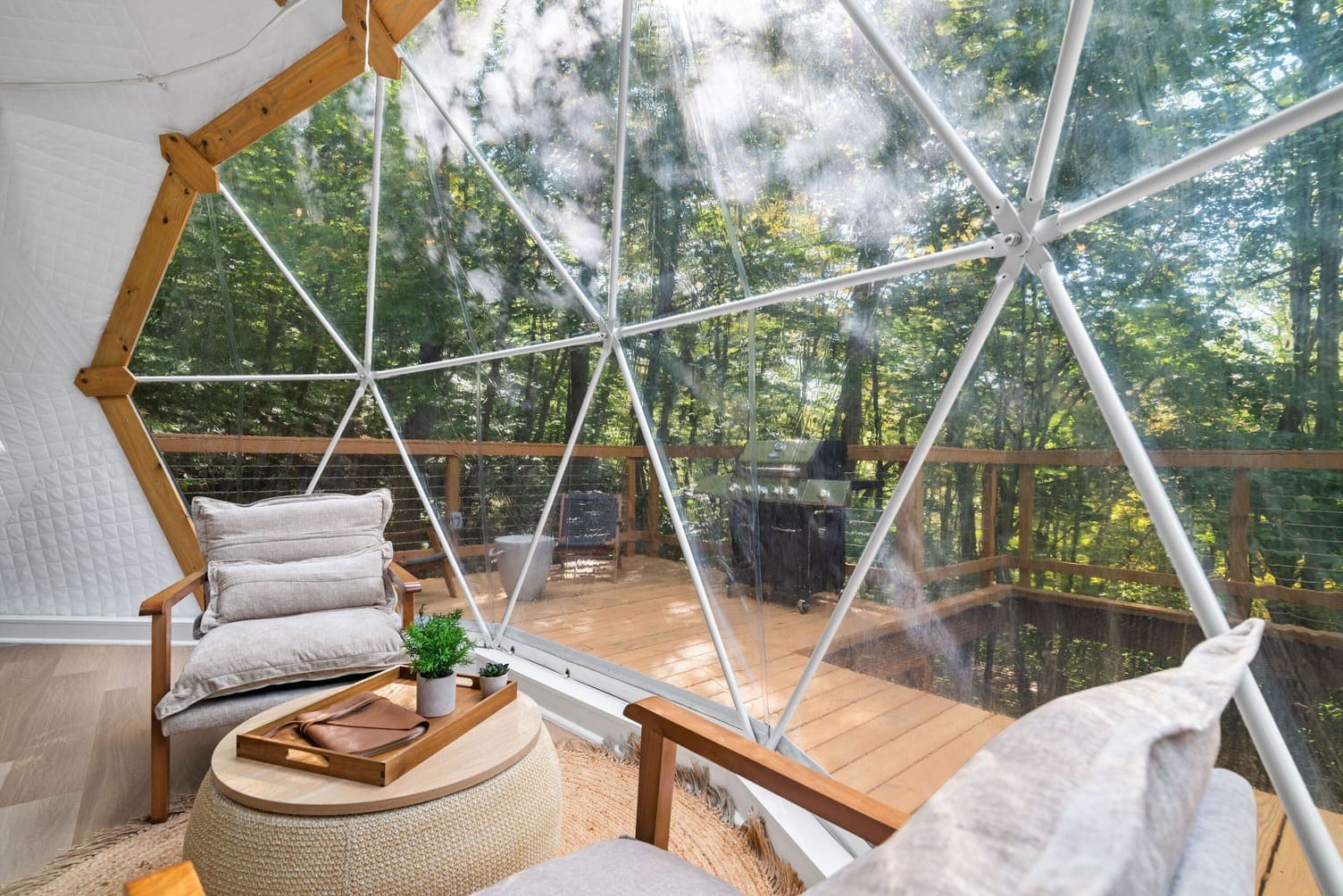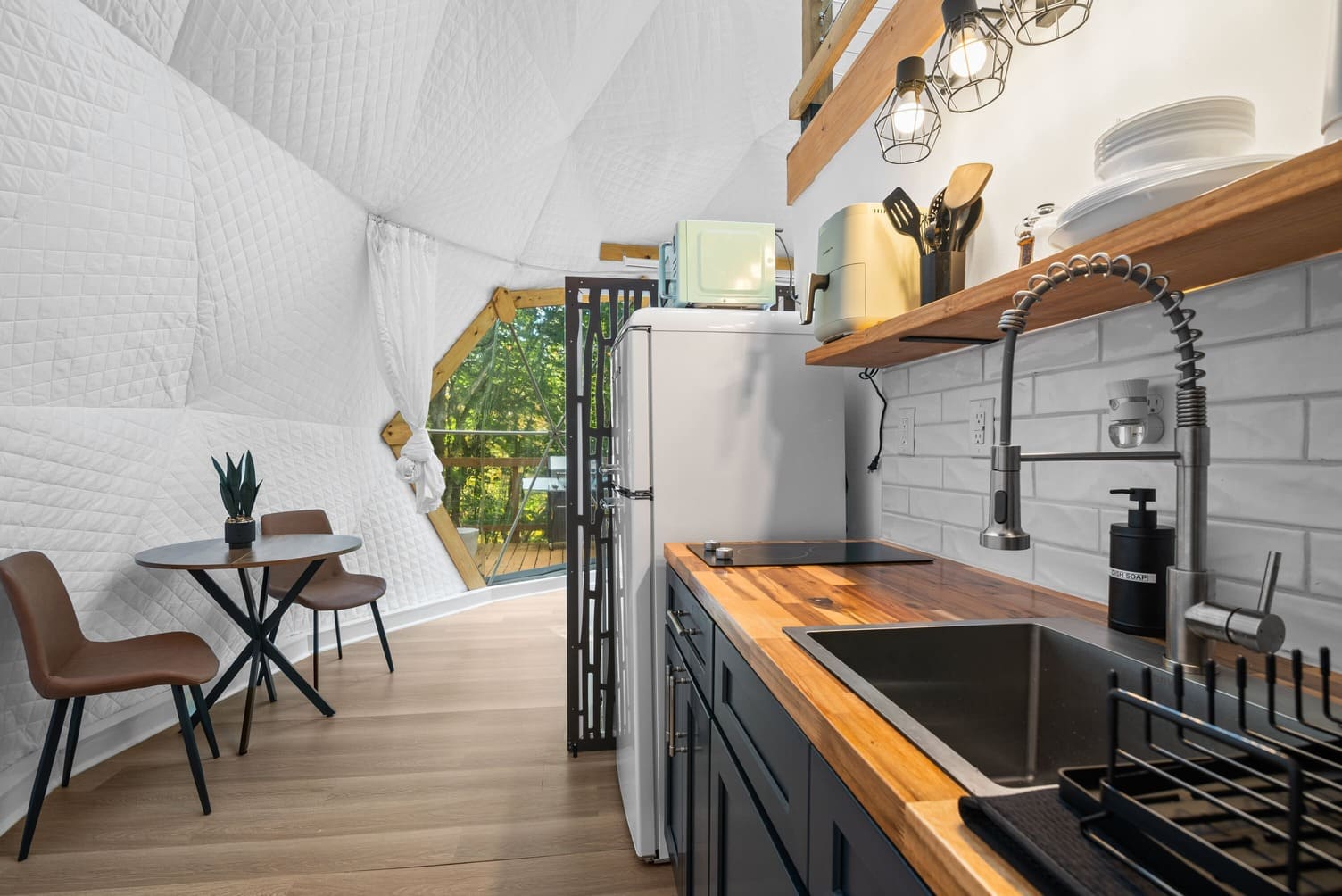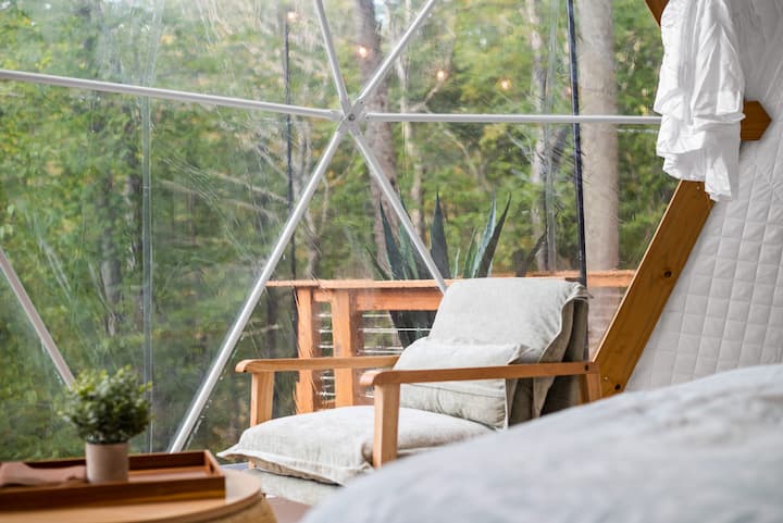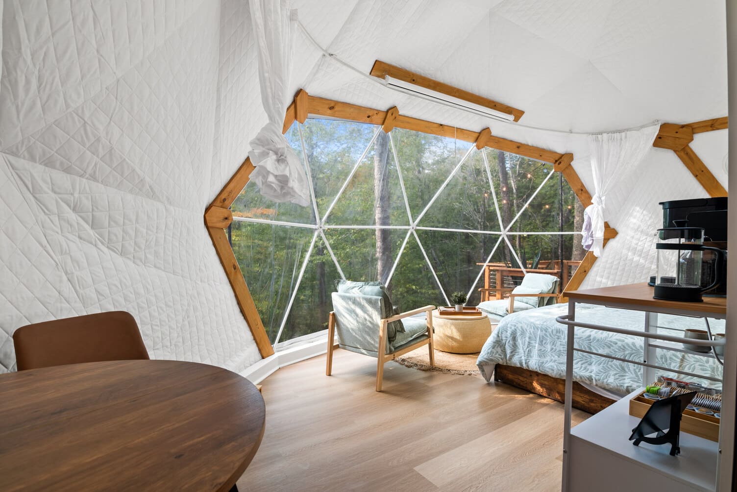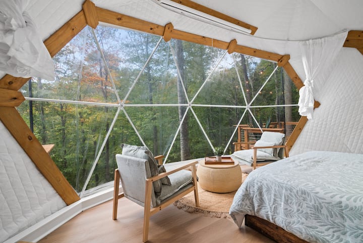 Enjoy a cozy geodesic dome equipped with a full kitchen, elegant finishes, and panoramic windows that bring the forest inside.