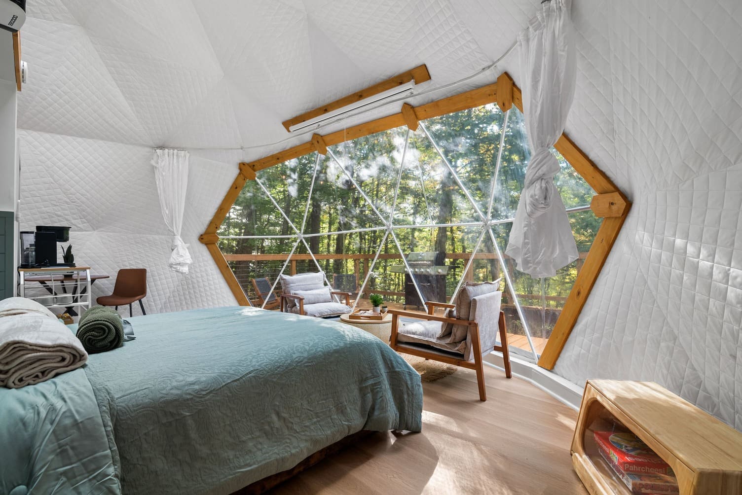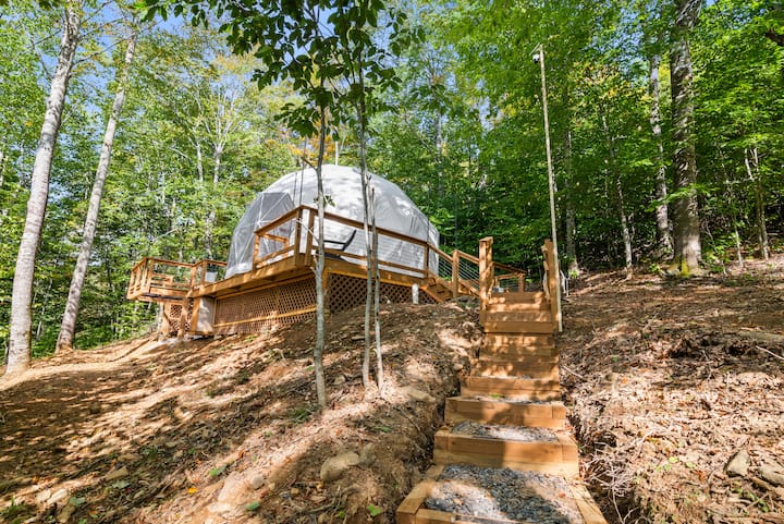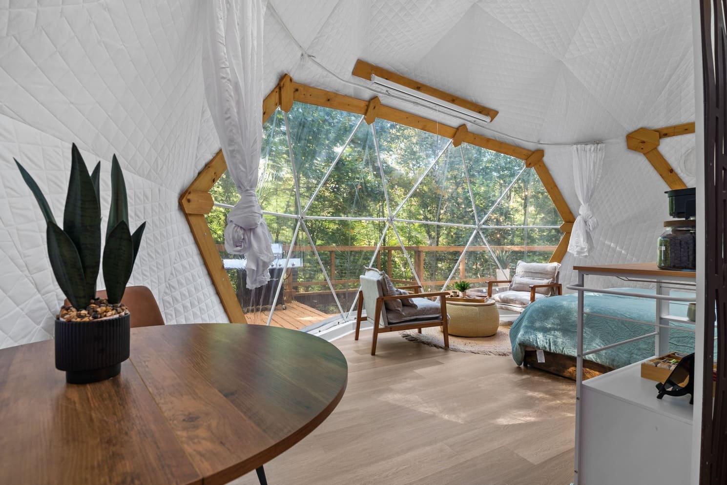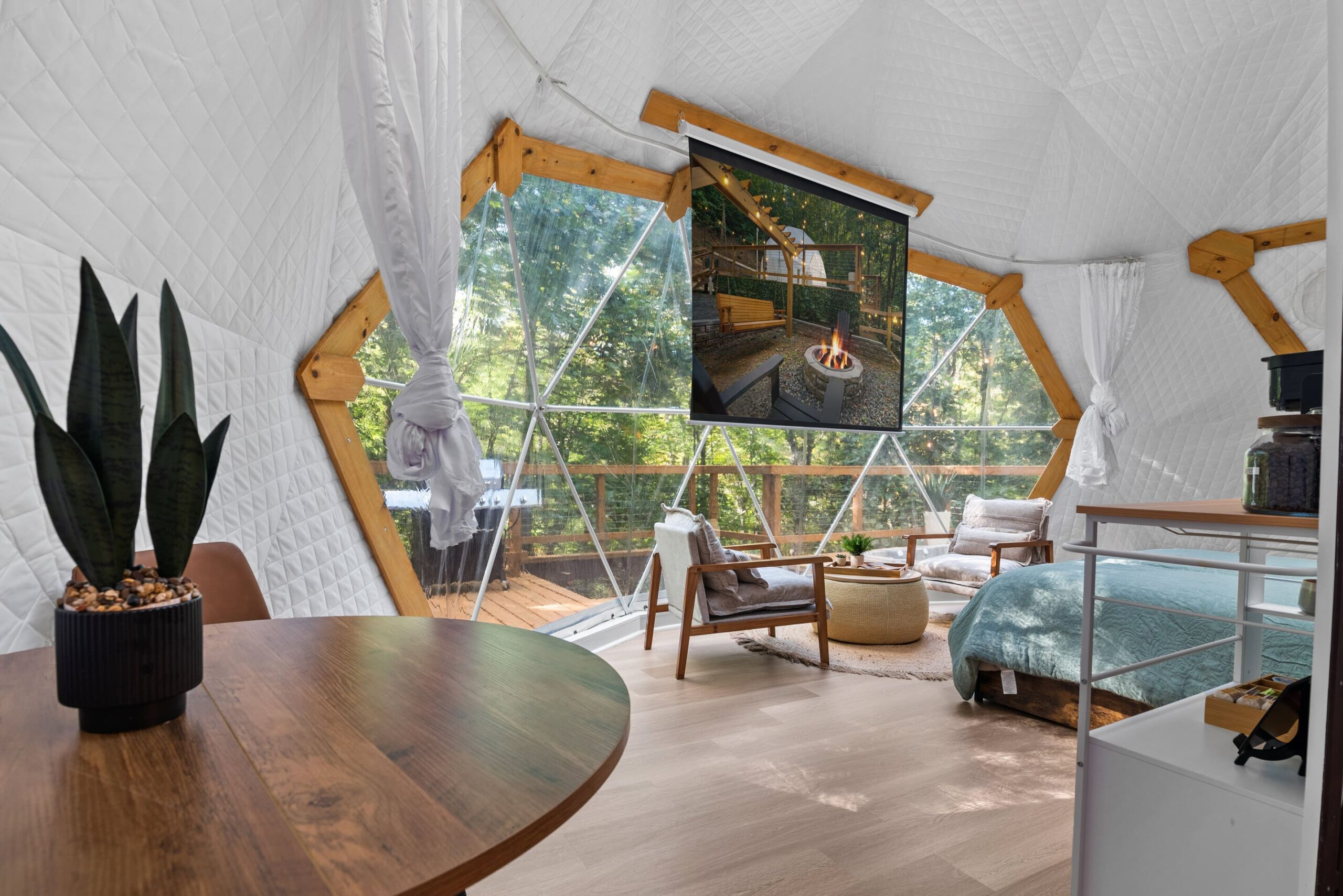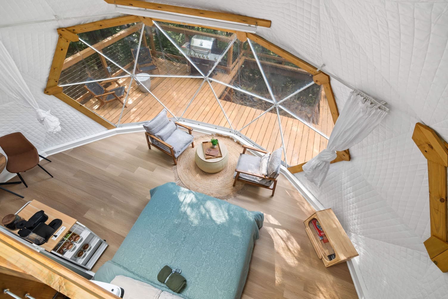 Enjoy a cozy geodesic dome equipped with a full kitchen, elegant finishes, and panoramic windows that bring the forest inside.
