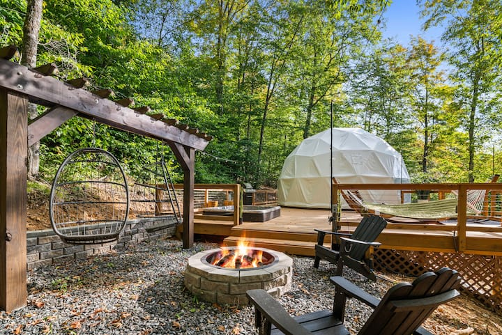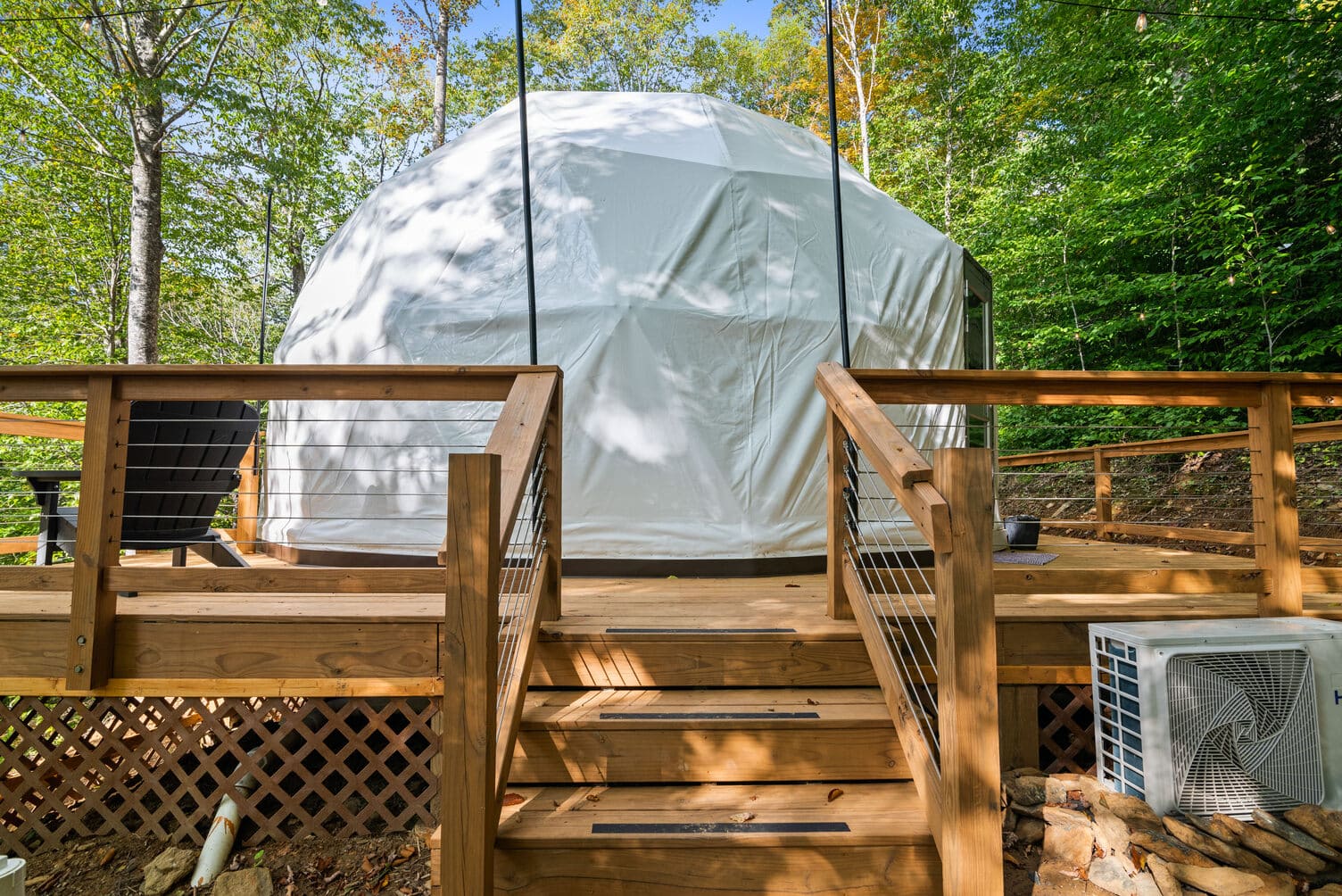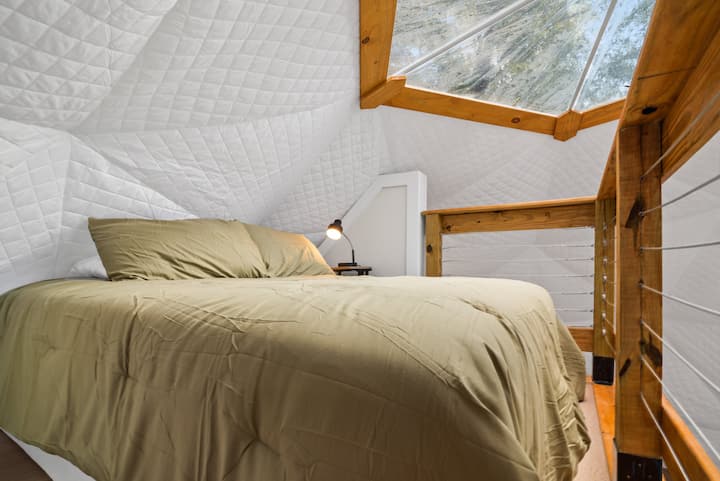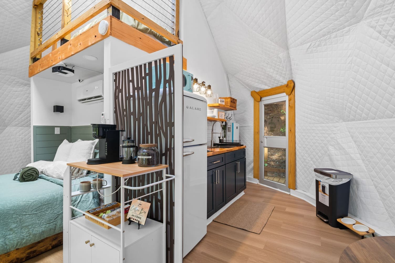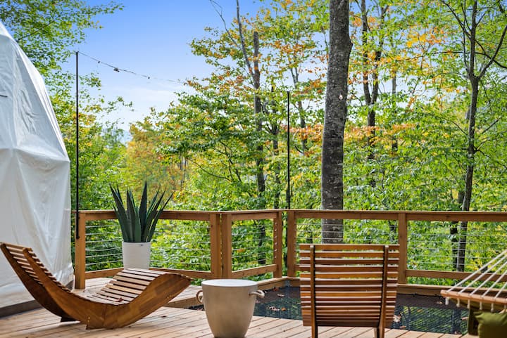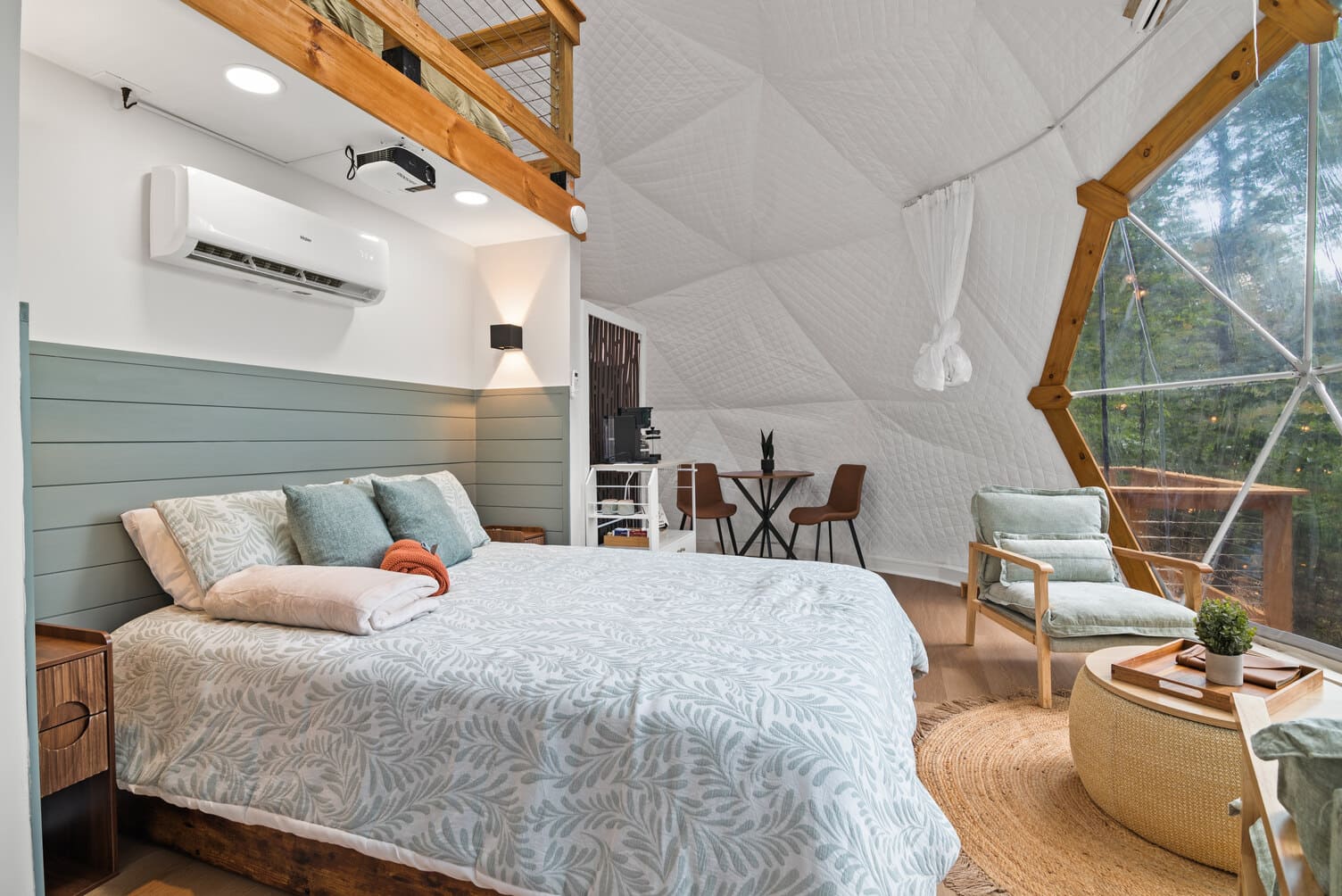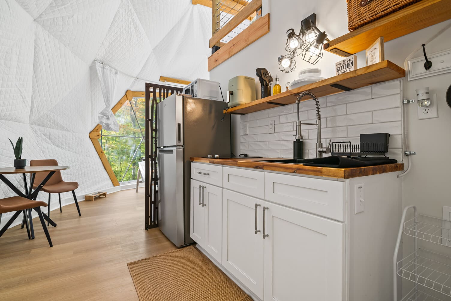 Enjoy a cozy geodesic dome equipped with a full kitchen, elegant finishes, and panoramic windows that bring the forest inside.