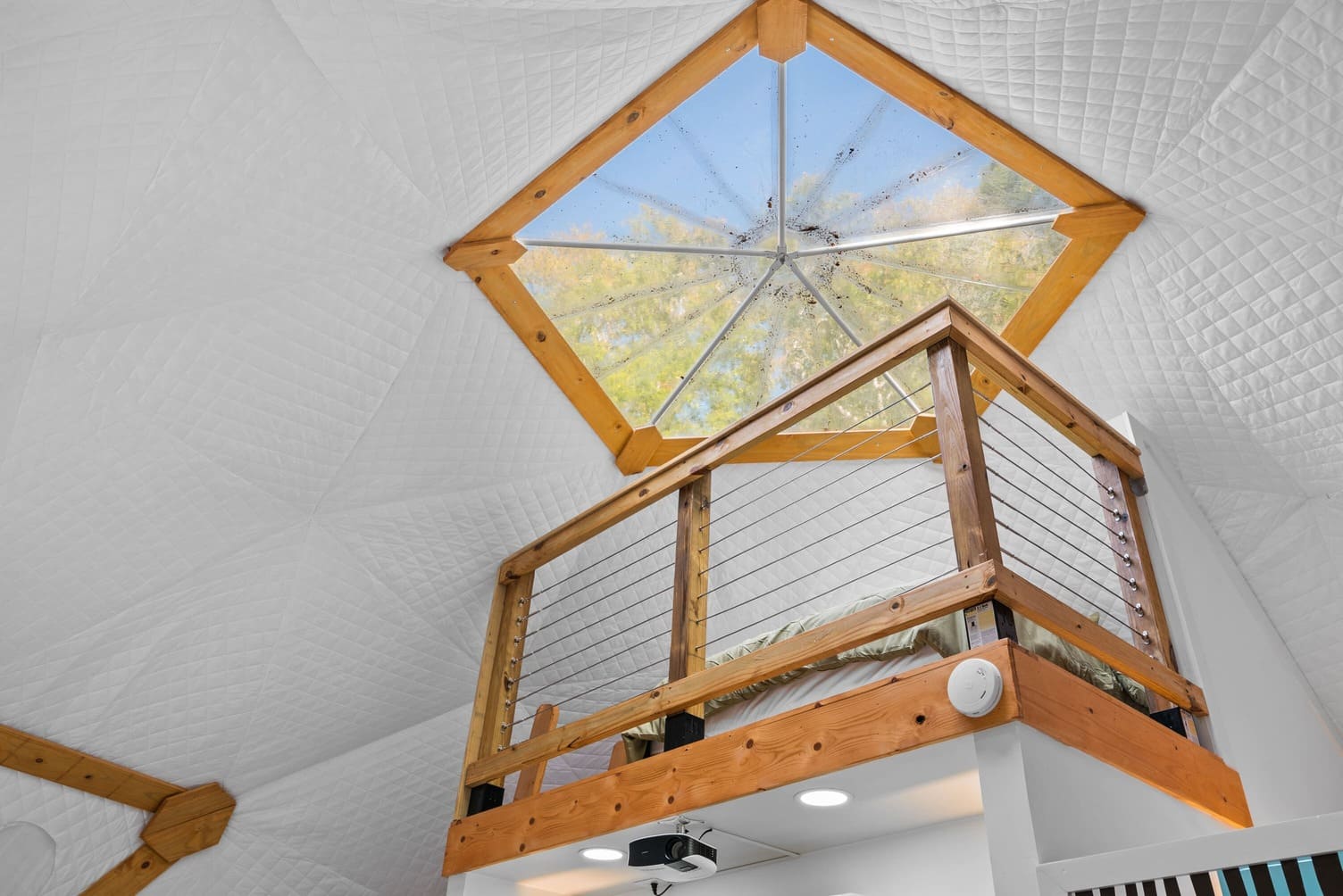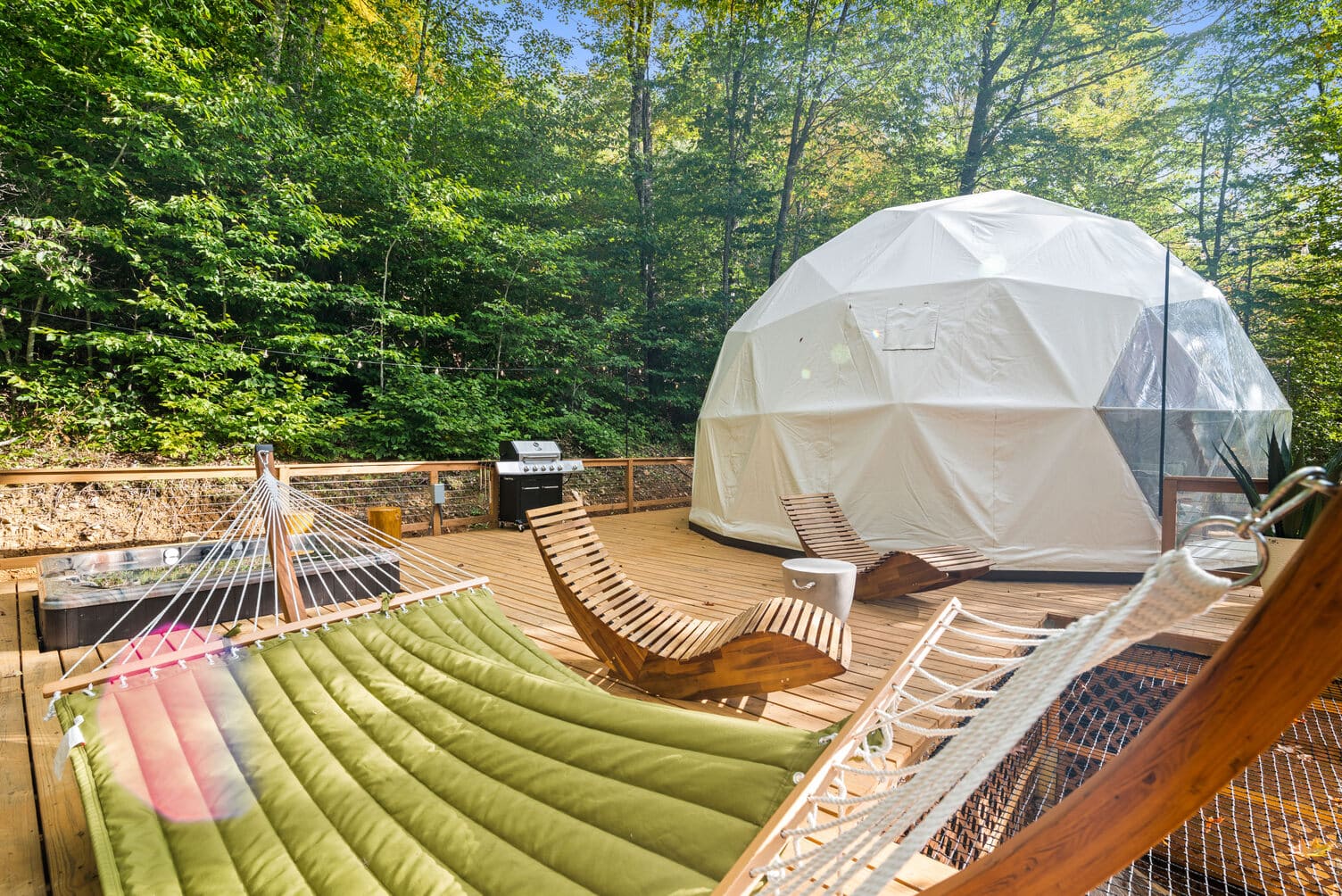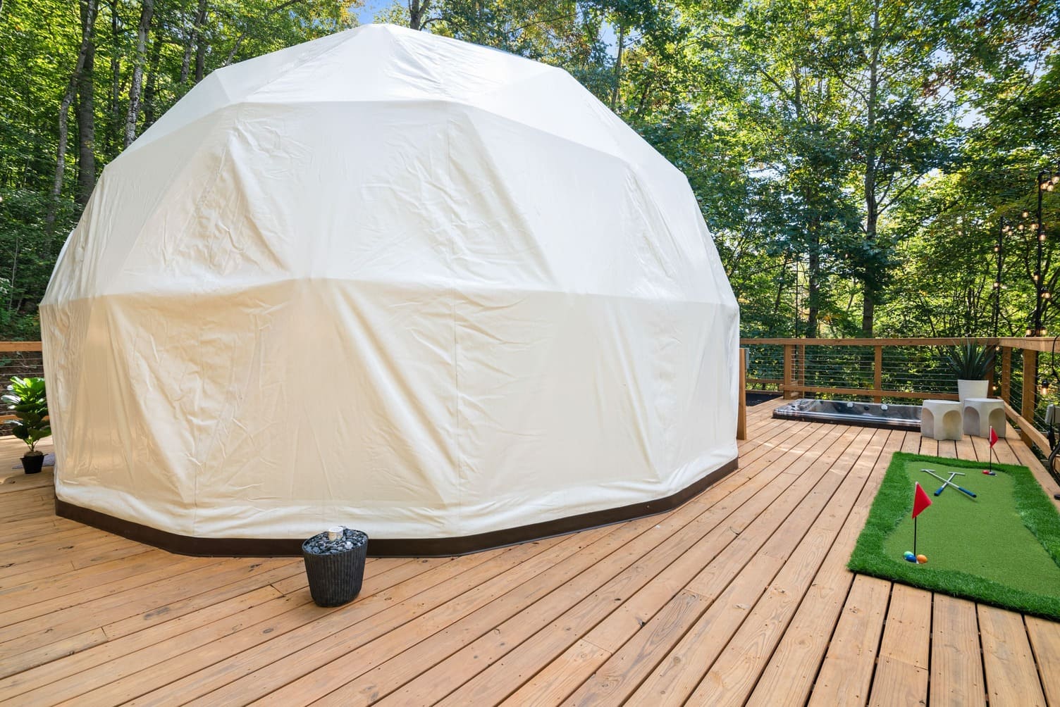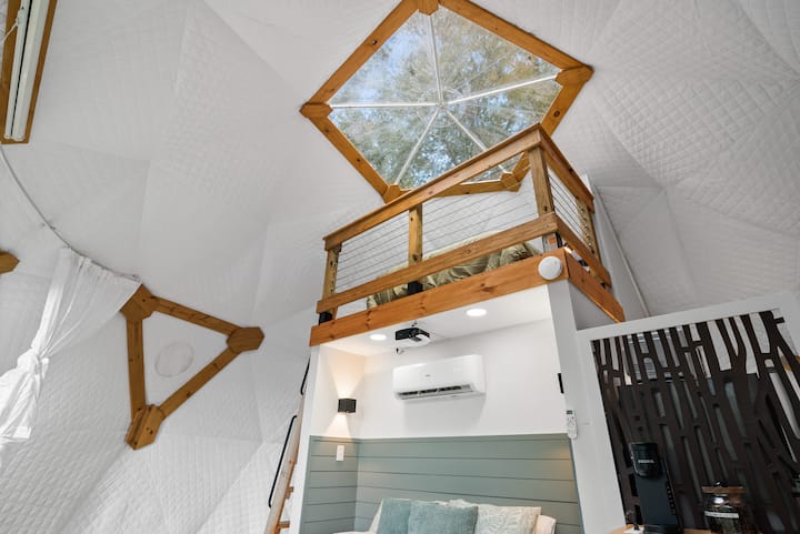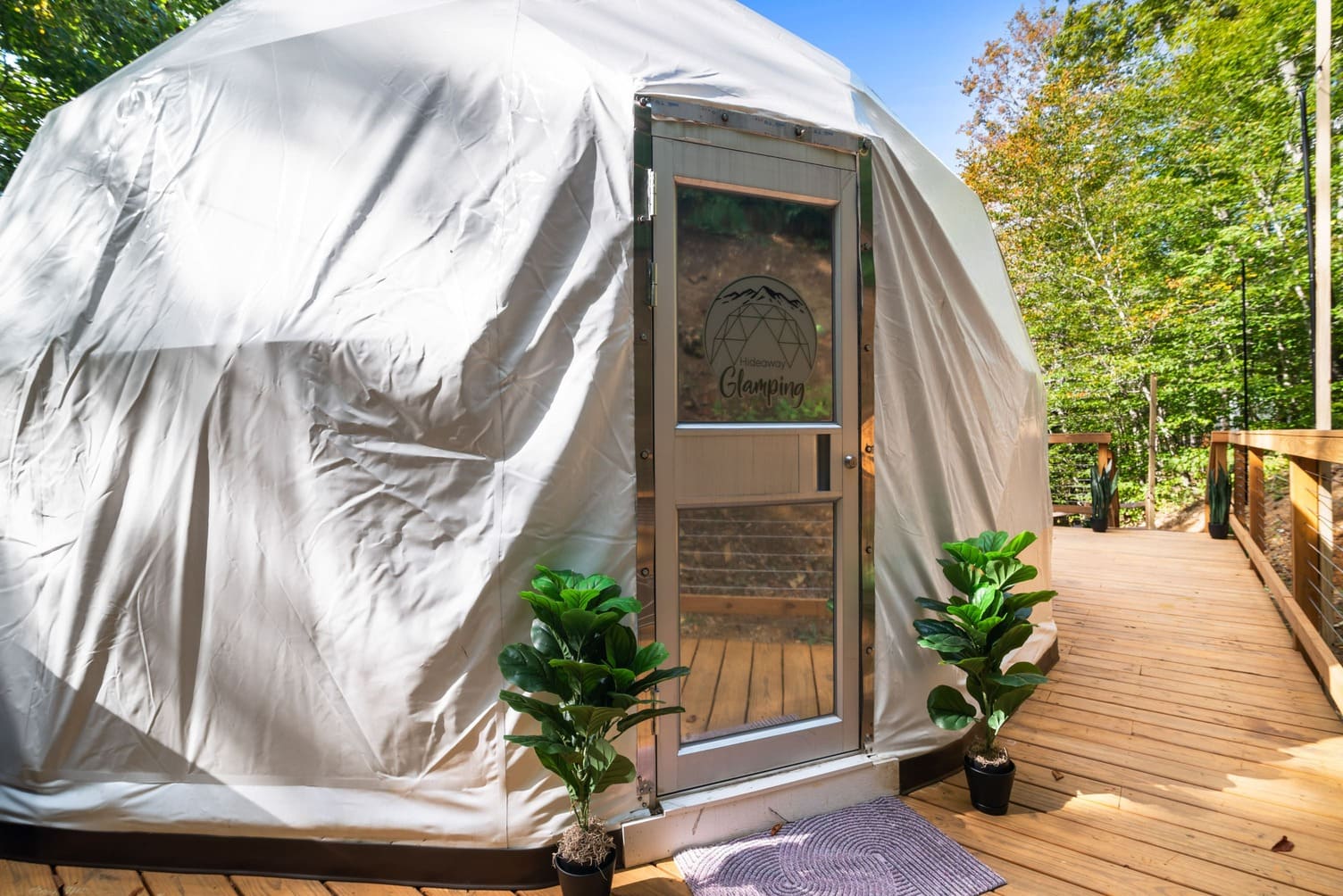 Enjoy a cozy geodesic dome equipped with a full kitchen, elegant finishes, and panoramic windows that bring the forest inside.