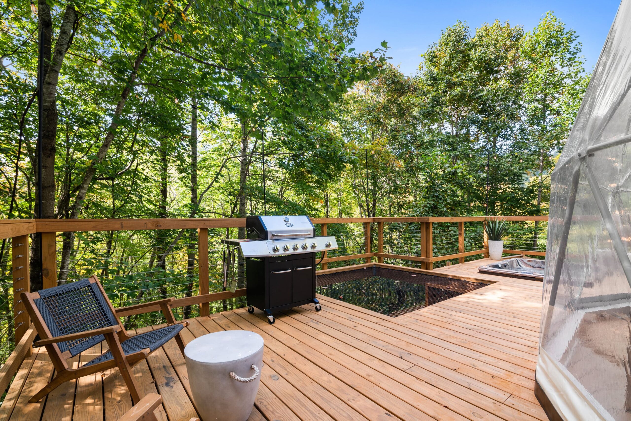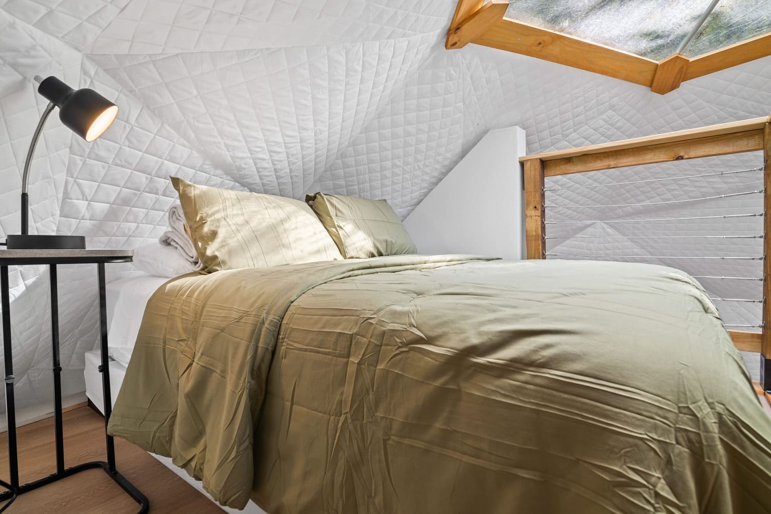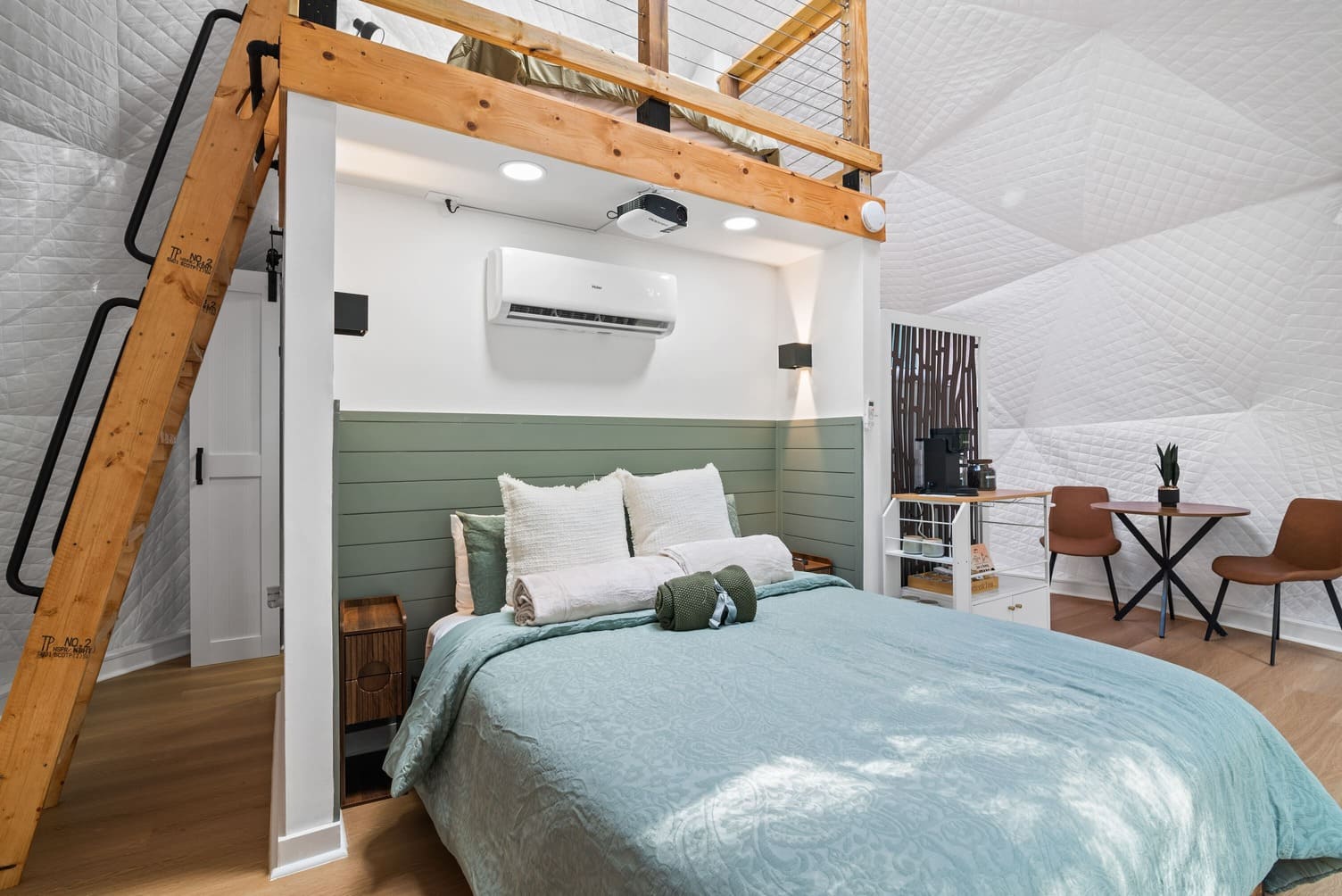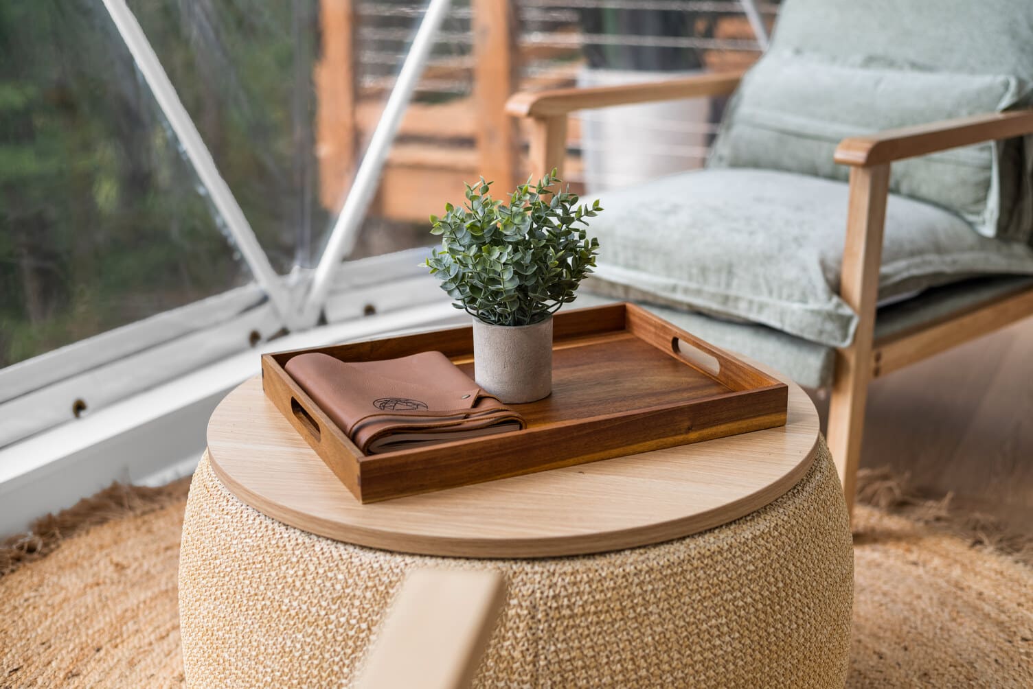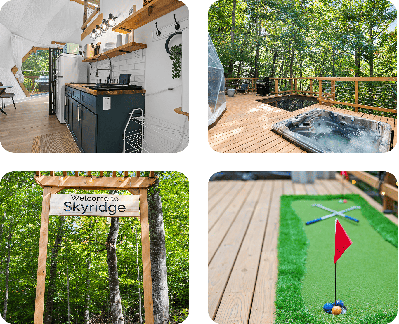 Enjoy a cozy geodesic dome equipped with a full kitchen, elegant finishes, and panoramic windows that bring the forest inside.